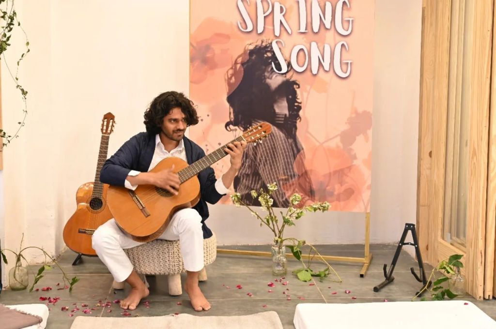 Born as the sister counterpart to Autumn Air, this performance series explores the cycles of the seasons through a multidisciplinary lens. The debut of this series, the inaugural Spring Song, took place on February 22nd, 2025, at Brew Casa, Dehradun. Created in a soulful collaboration with Prakriyaa, the evening was designed as a communal ritual of renewal. It was conceptualised and performed by Prashant Nawani in collaboration with Harshita Srivastava (permaculturist and designer), Feruza Abdullaeva (artist and thinker), and Srinjoy Ghosh (educator and psychologist).