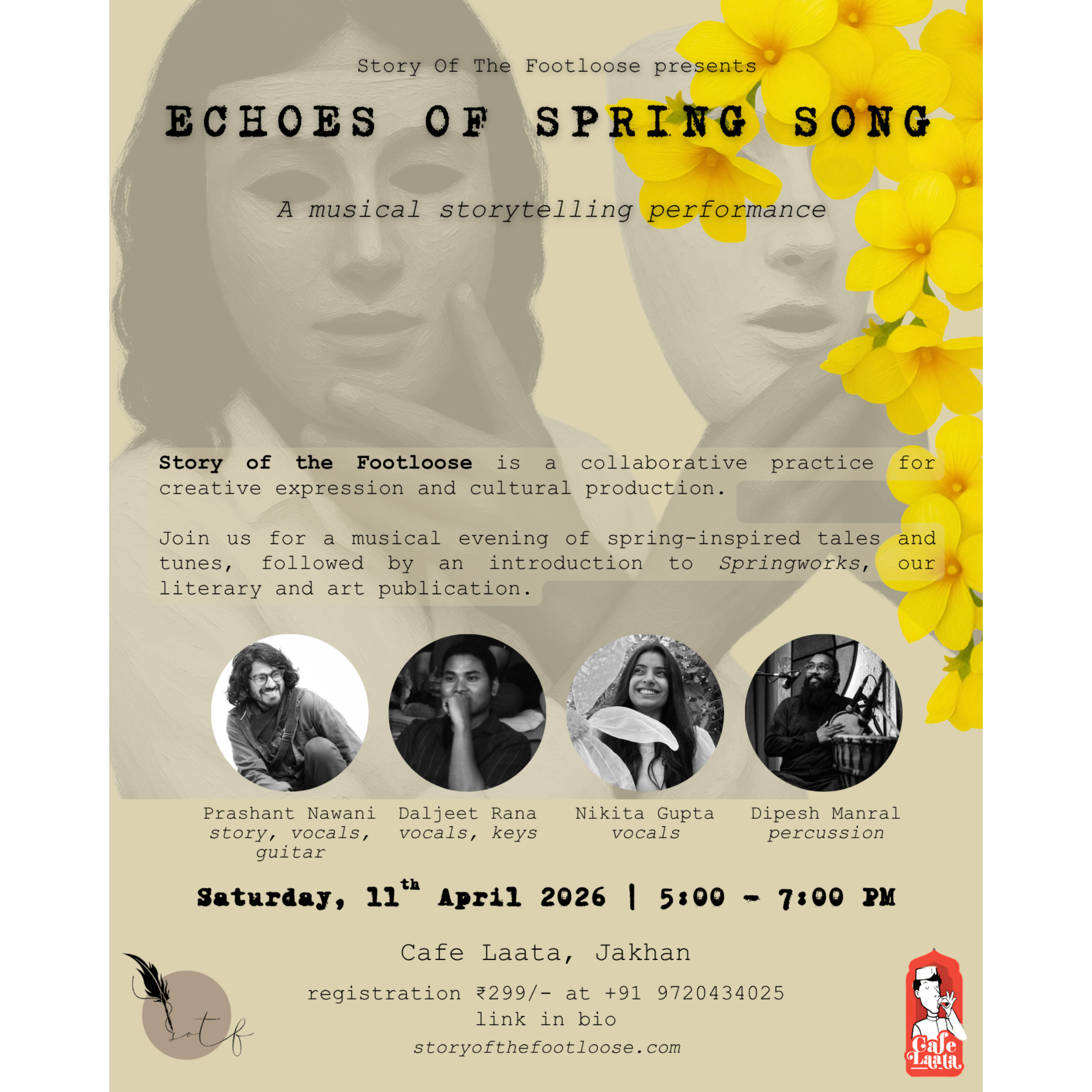 - The Spring Song Concert: Storytelling and spoken word interlaced with live music and SFX, paired with the fluid expressions of Kathak (a storytelling dance form). Together, we retell Pahadi folklore(and more) in conversation with stories and melodies from across the world and some original compositions.